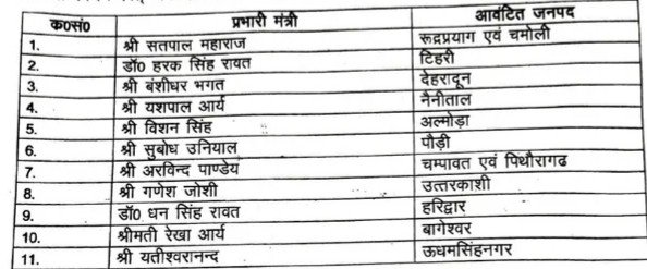 हरक सिंह रावत को टिहरी, यशपाल आर्य को नैनीताल, बिशन सिंह चुफाल को अल्मोड़ा, सुबोध उनियाल के पौड़ी, अरविंद पाण्डेय को चंपावत एवं पिथौरागढ़,गणेश जोशी को उत्तरकाशी, धन सिंह रावत को हरिद्वार, रेखा आर्य को बागेश्वर तथा यतिस्वरानंद को उधम सिंह नगर का प्रभार दिया गया है।